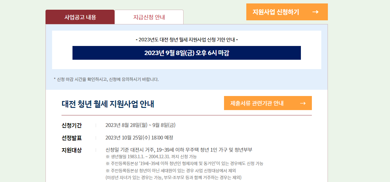- 월세 선 납부 후 청년 본인니 매월 1~5일 홈페이지에서 전월 지원금 지급을 신청합니다.