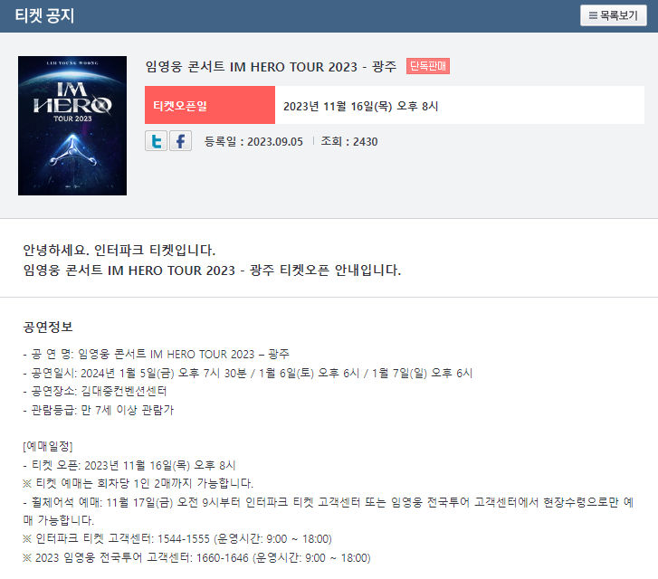 가수 임영웅이 지난해에 이어 올해도 2023년 임영웅 전국투어 콘서트 'IM HERO'(아임 히어로) 광주 공연을 3회에 걸쳐 진행합니다. 모두들 예상했듯이 이번에도 피티켓 전쟁이 될 전망입니다. 광주에 사시는 분들은 공연 일정을 확인하시고 예매 오픈일에 성공적인 티켓팅을 하시 길 바랍니다.