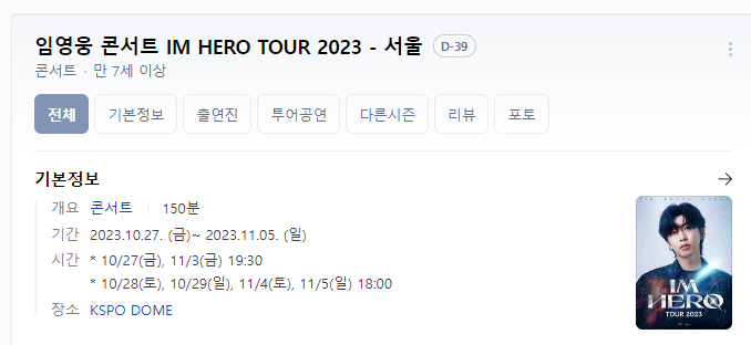 가수 임영웅이 지난해에 이어 올해도 2023년 임영웅 전국투어 콘서트 'IM HERO'(아임 히어로) 서울 공연을 6회에 걸쳐 진행합니다. 특히 6회 차 서울 공연의 티켓이 한꺼번에 14일 오후 8시 인터파크 티켓예매를 통해 티켓이 오픈되어 예매 시작 1분 만에 매진이 이루어졌습니다. 동시 접속자만 40만 명가량이 몰려서 서버가 일시 멈추는 오류도 발생했습니다.