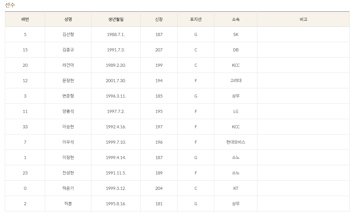 문성곤 선수의 부상이탈에 이은 또 한명의 핵심자원인 송교창이 안타깝게도 연습경기에서 후방십자인대손상 부상으로 재활과 회복에 어려움을 겪었고 최종 명단에서 하차하게 되었습니다. 문성곤을 대신한 양홍석에 이어 송교창의 대체자원으로 변준형이 선택되었습니다.